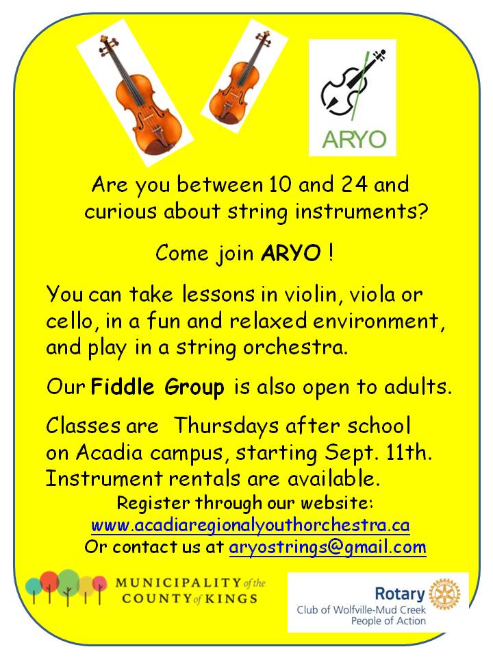 We really hope you will consider joining us at ARYO! We are very grateful to families and instructors for the enthusiastic support which allowed us to keep the orchestra program running through the pandemic, and we are looking forward to continuing our mission of offering the opportunity to learn string instruments and to play in string and full orchestra to as many students in the Annapolis Valley region as possible.