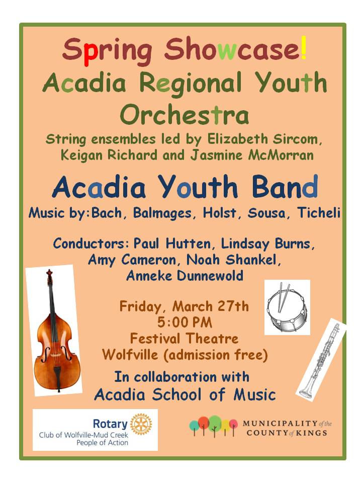 For the coming season, our basic schedule and fees are the same as for the previous season. Rehearsals will take place at Denton Hall, on Acadia campus on Thursdays after school, starting THURSDAY SEPT. 11th. (Late registrations are still possible after this date.)